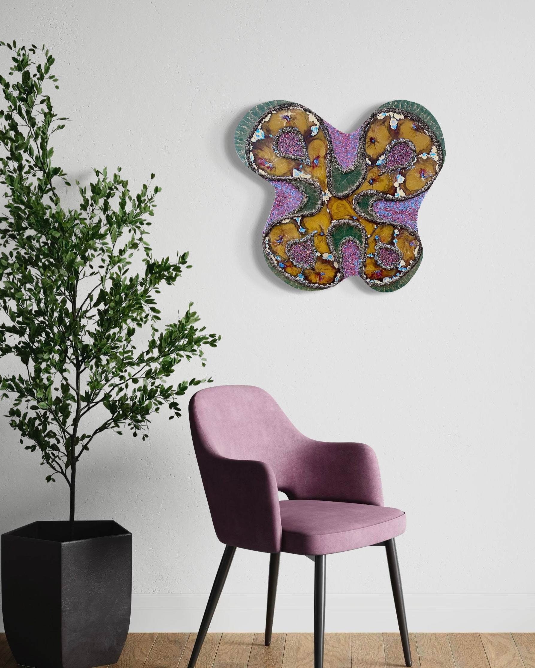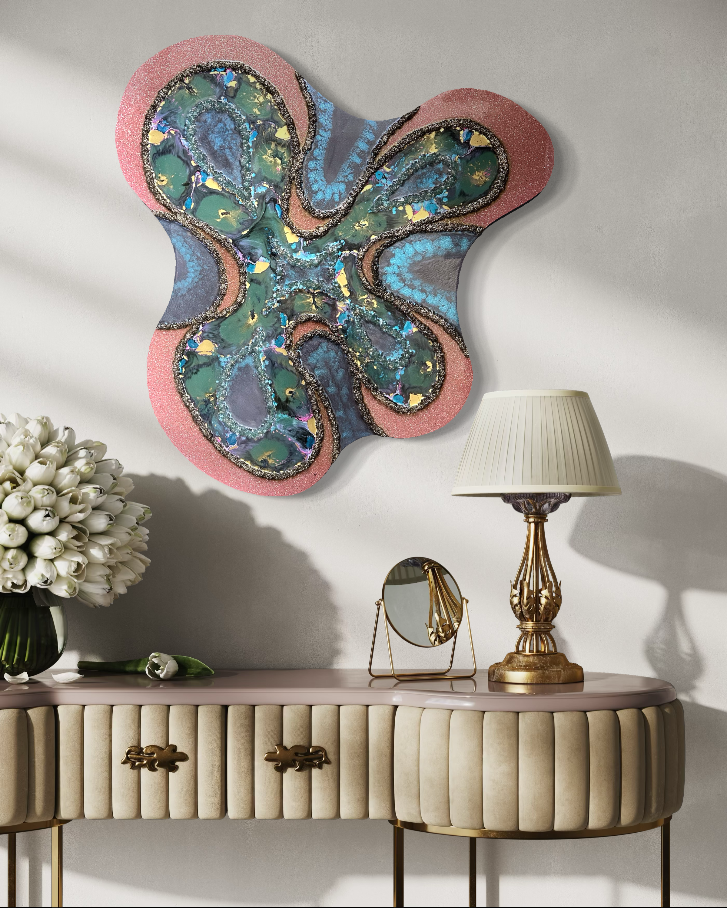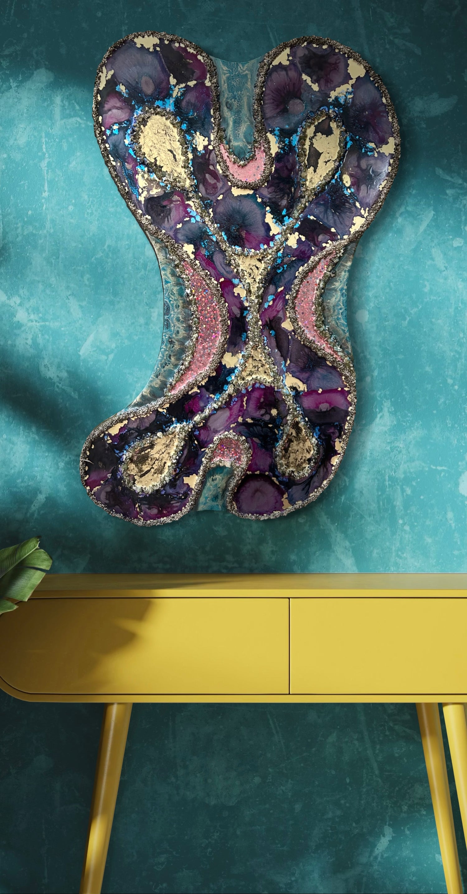expectation. Unusual colour pairings, jagged, stone-like textures, dense patterning and excessive glitter are combined within compositions that feel unfamiliar and slightly jarring. The forms resist easy recognition, existing somewhere between organic and otherworldly. While each piece carries a degree of visual discomfort, it also exerts a magnetic pull.