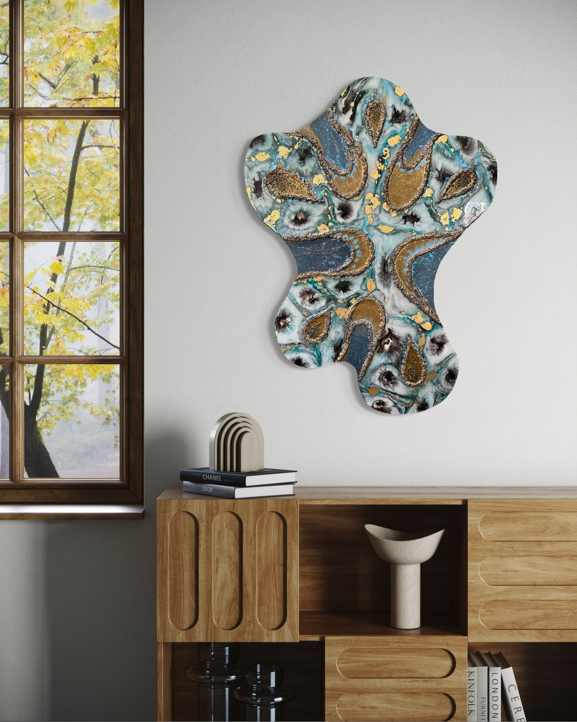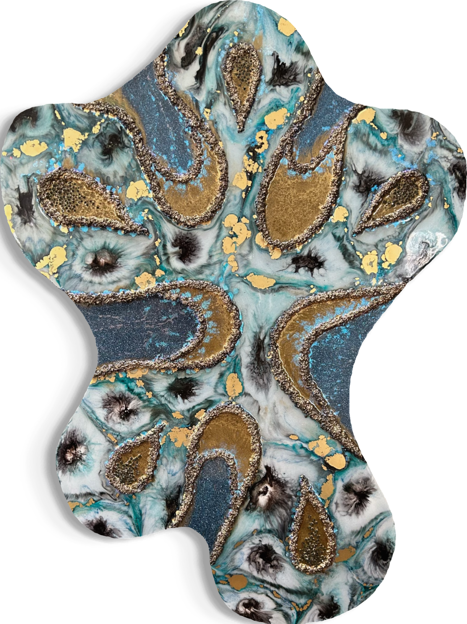 Like a warped whirlpool of ocean blues and glistening gold, the composition invites you in, puckering together at the centre, tempting you into its alluring depths.