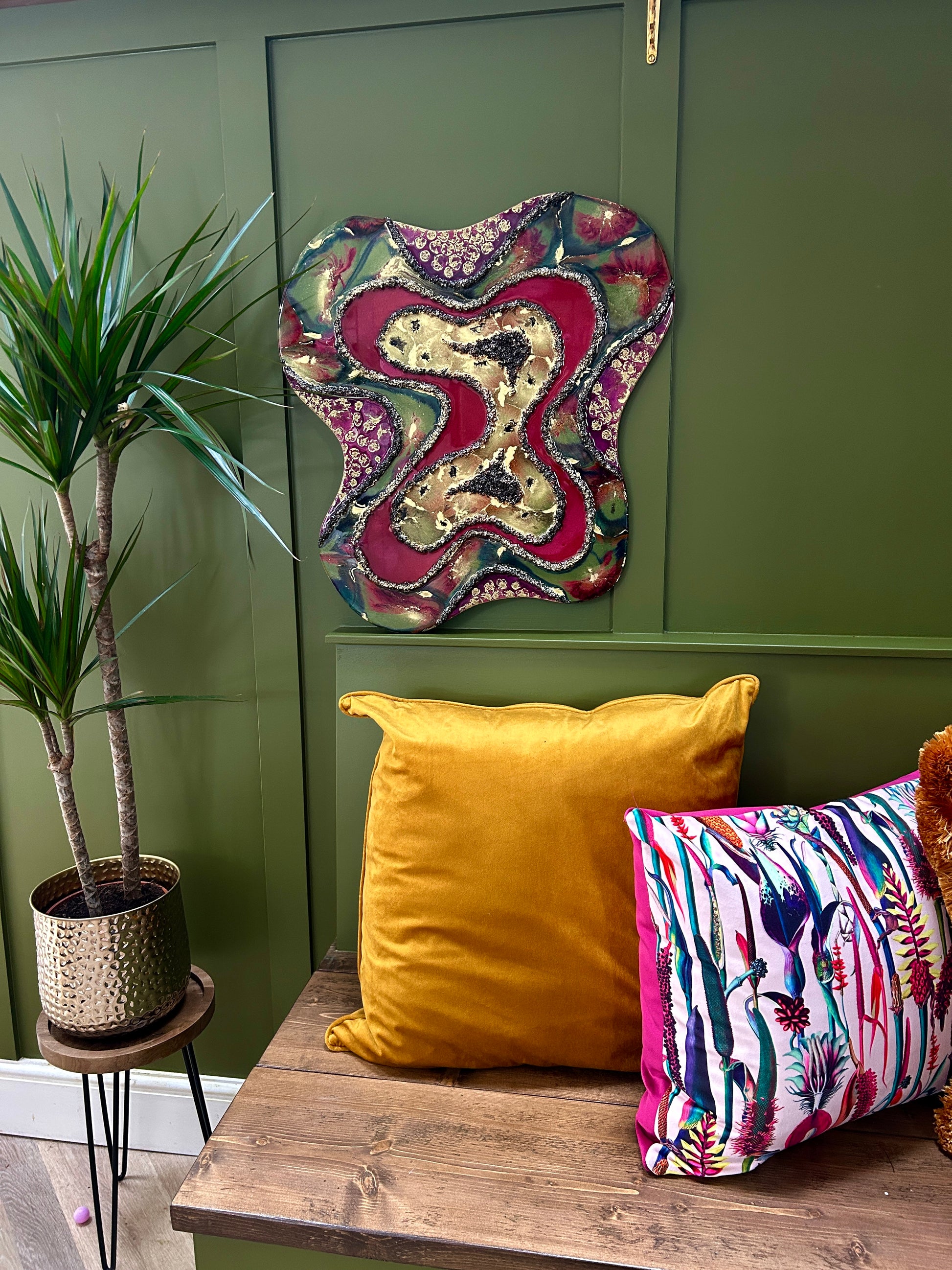 Beautiful alcohol inks and resin combined with sparkly texture, this gorgeous hanging heart artwork would add a splash of opulence to any setting.