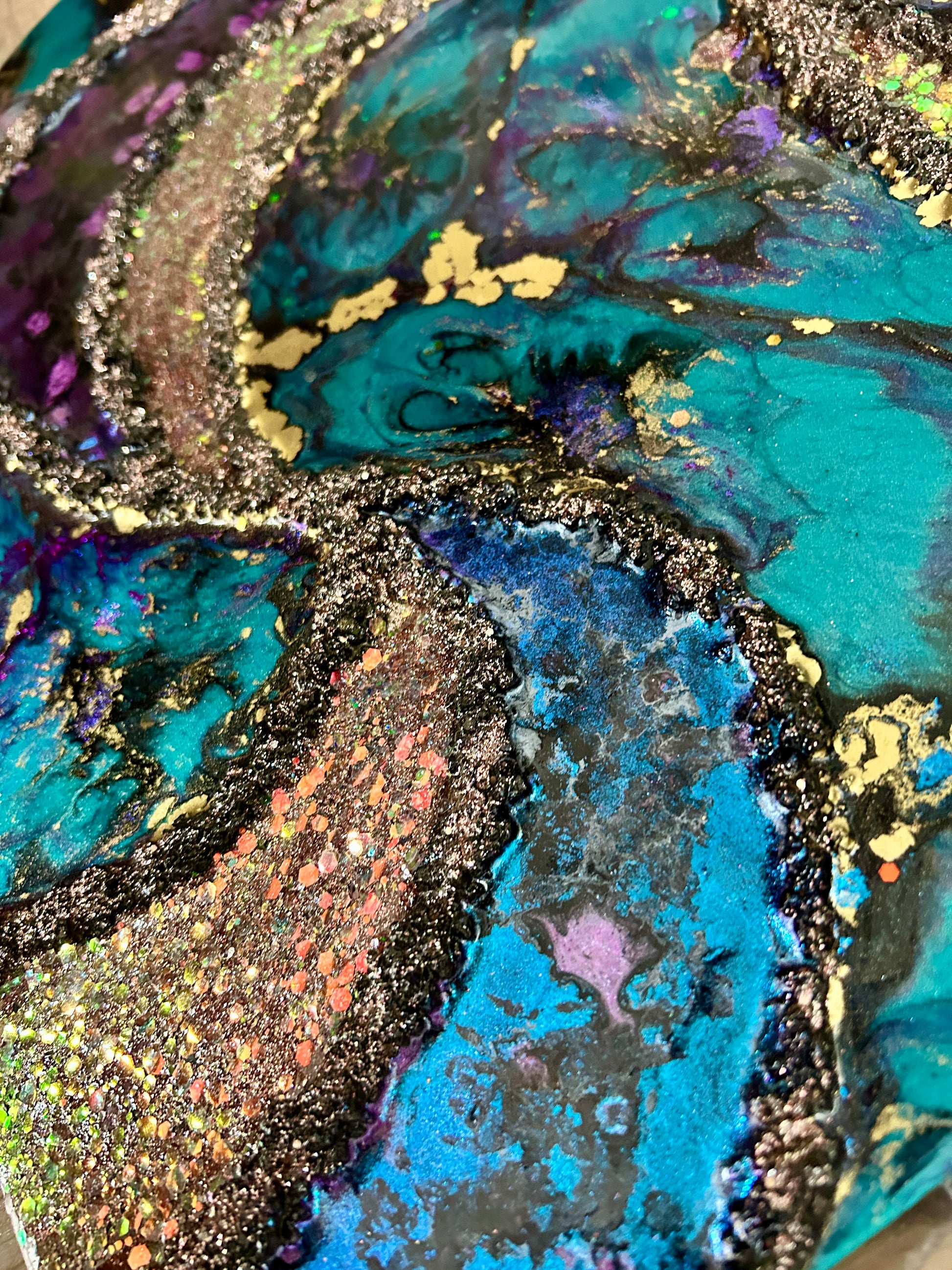 Beautiful alcohol inks and resin combined with sparkly texture, this gorgeous hanging heart artwork would add a splash of colour to any setting.