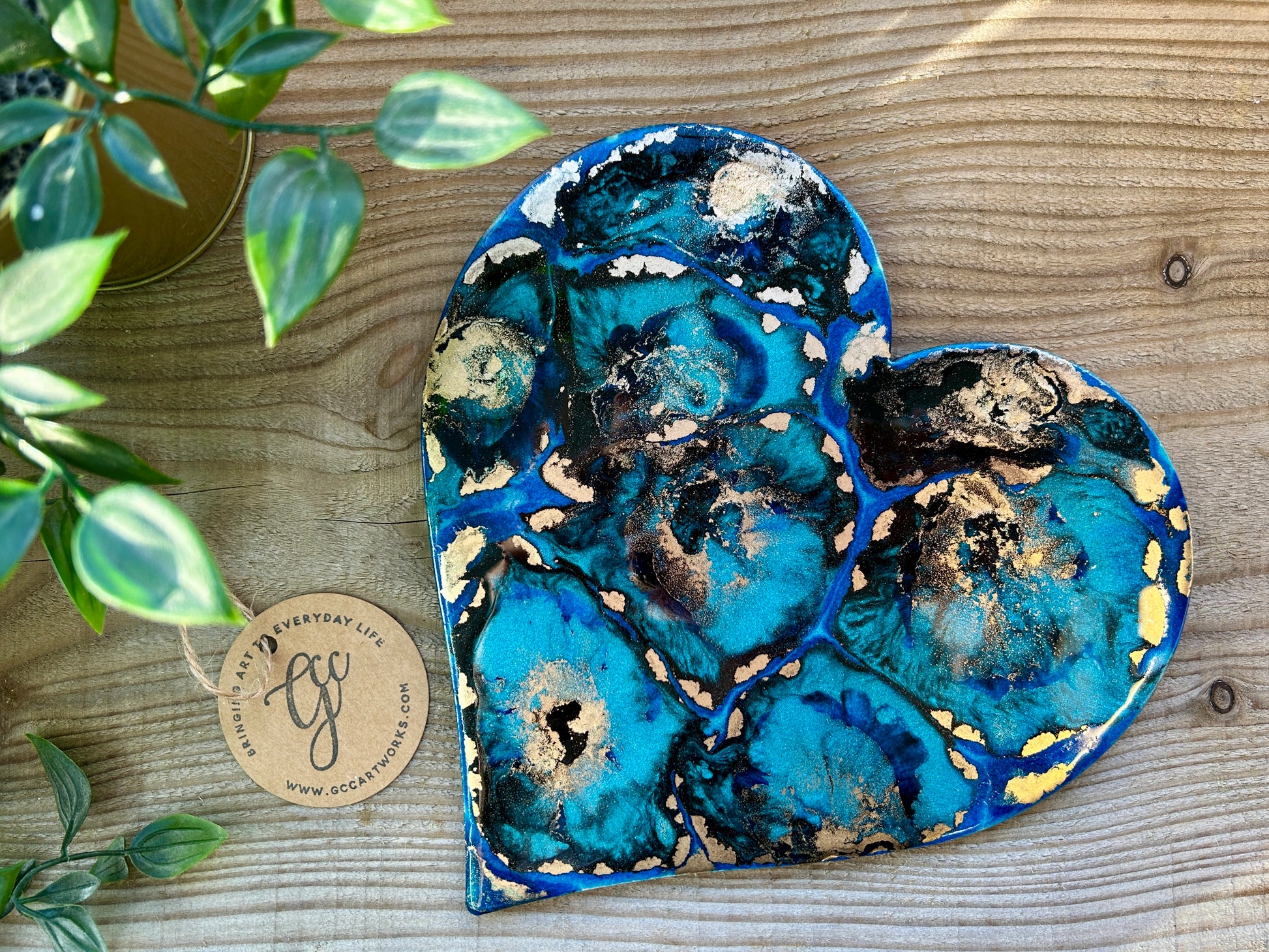 Resin and Alcohol Ink Original Hanging Heart Artwork - Blue and Gold