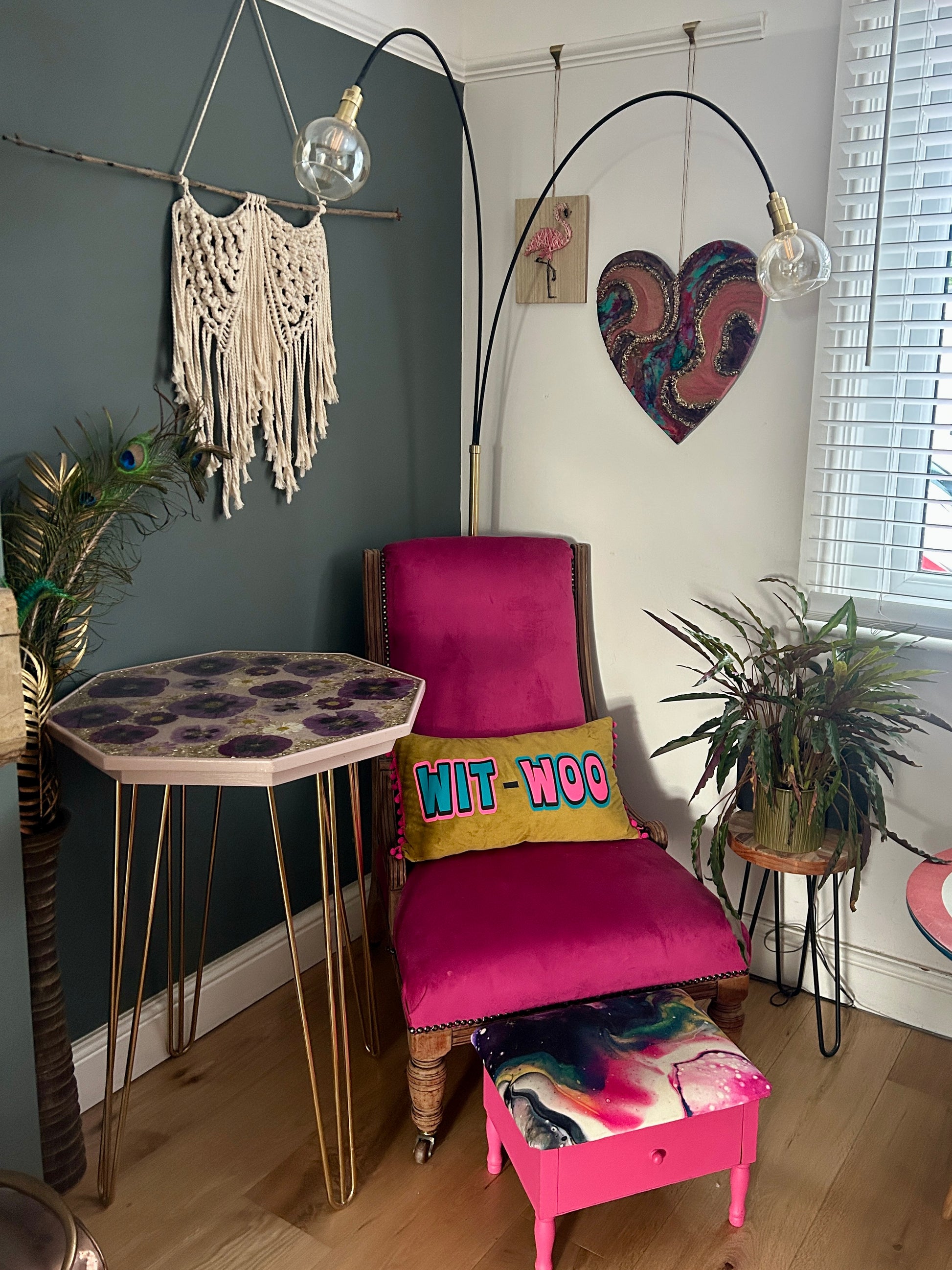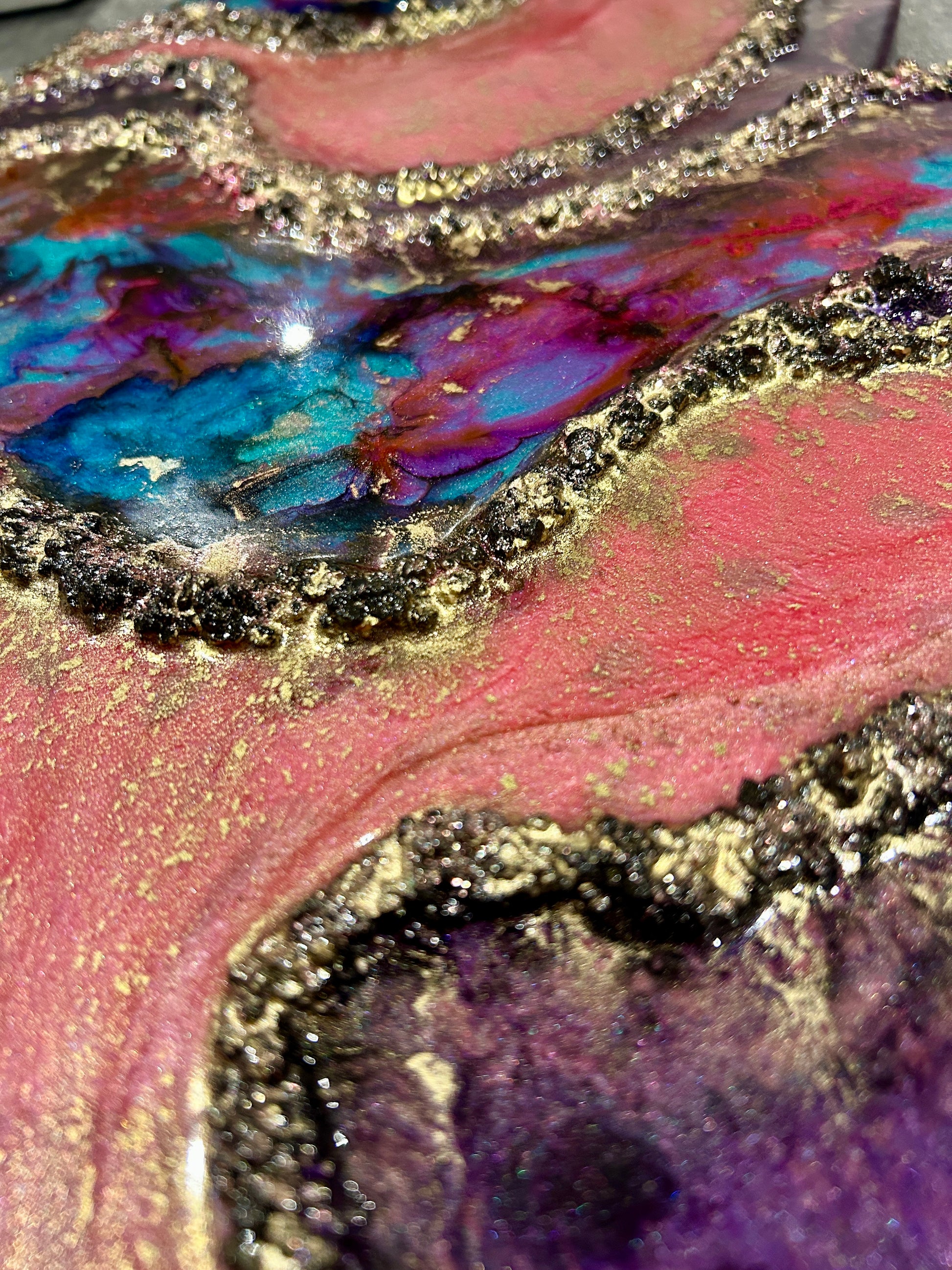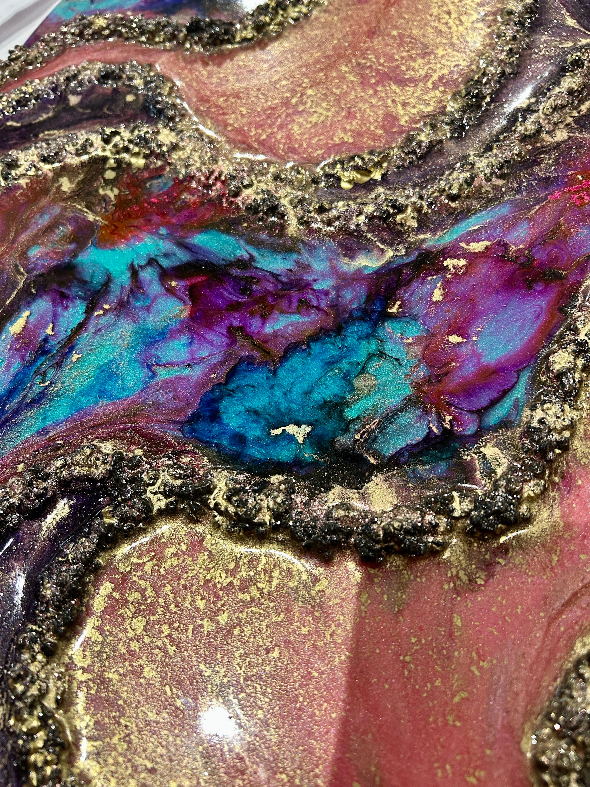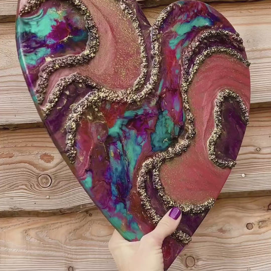 Beautiful alcohol inks and resin combined with sparkly texture, this gorgeous hanging heart artwork would add a splash of colour to any setting.