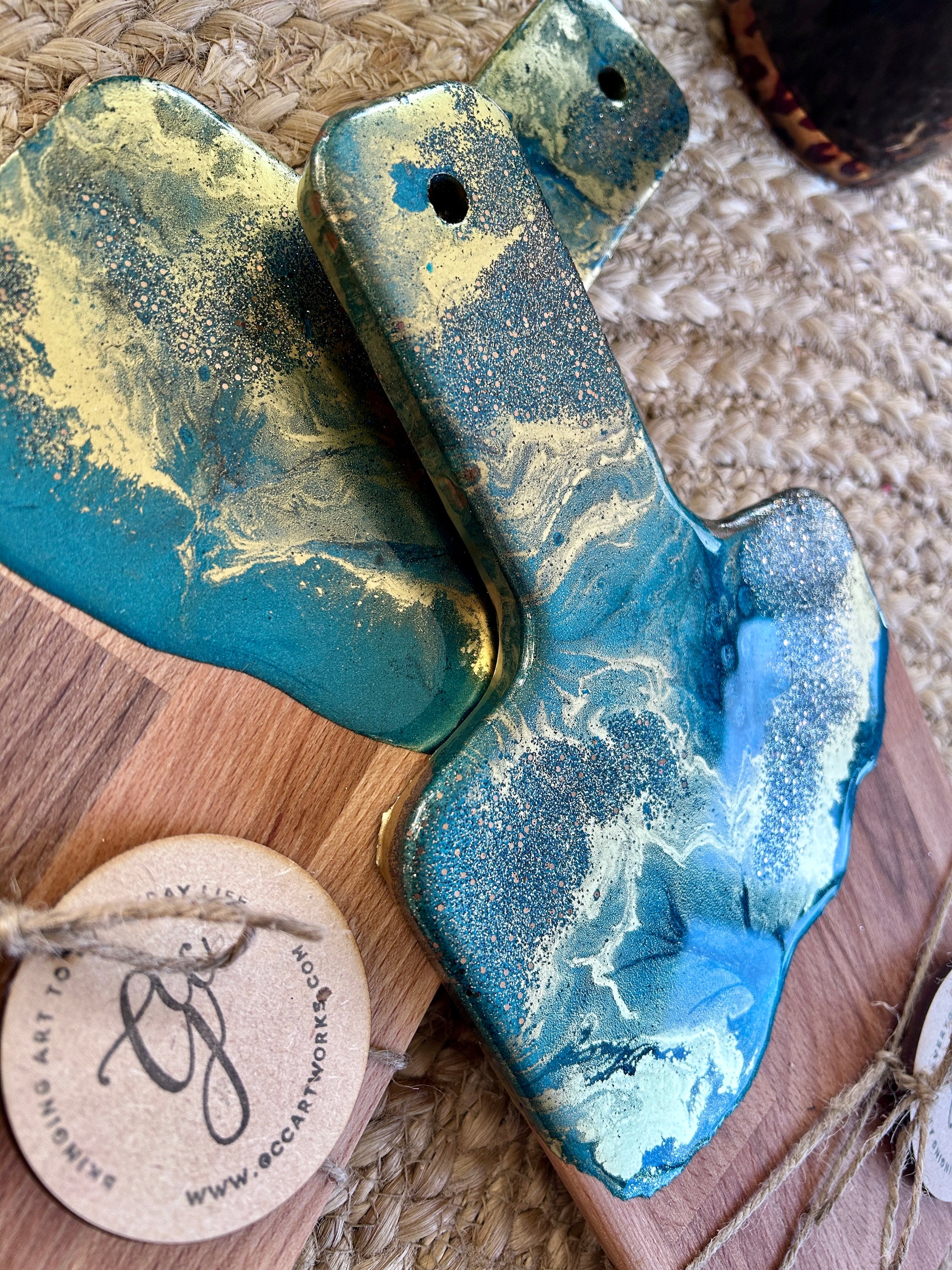 Individual Resin Art Beech Wood Serving Paddle - Turquoise and Gold